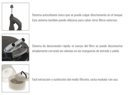 Los filtros SPACE EKO se venden completos, incluye materiales filtrantes mecanicos y biologicos, ademas de las mangueras y conexiones necesarias, soportes, un sistema de liberación rápida para facilitar la extracción, cestas multicapa y cierres resistentes.