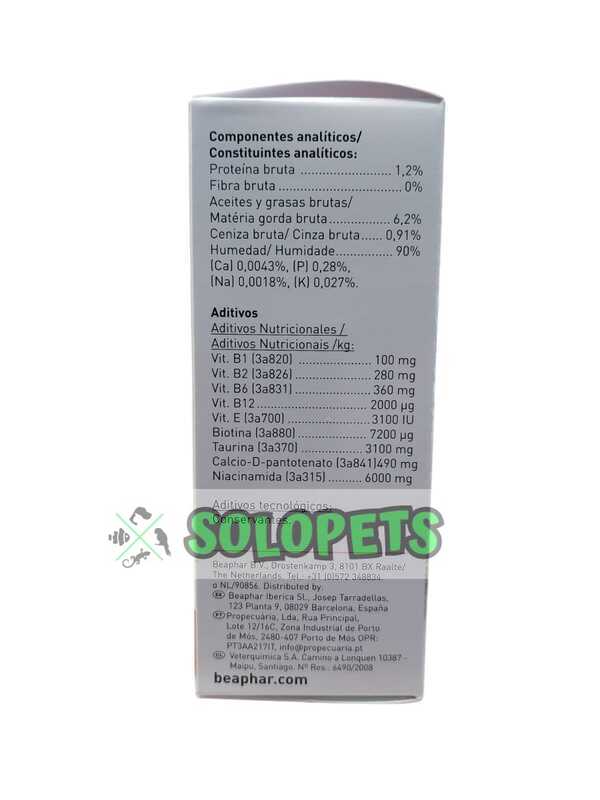 - Beaphar Multivitaminas con taurina contiene vitaminas beneficiosas que ayudan a mantener la piel y pelo saludable.